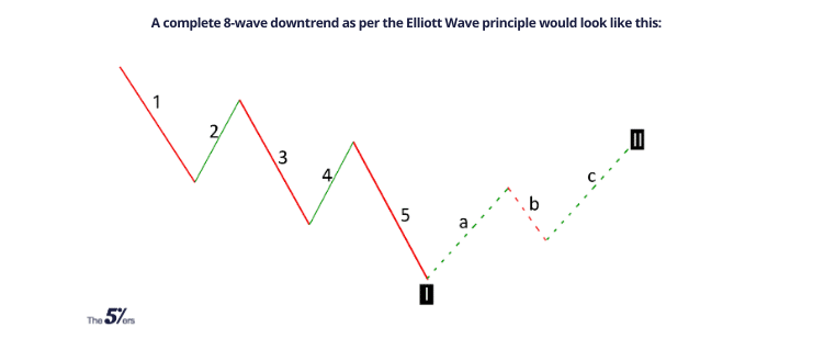 In a nutshell, an Elliott wave Theory is said to be complete once all the 8 waves have been formed. The wave marked “I” is the main trend while wave “II” is the reversal trend.
