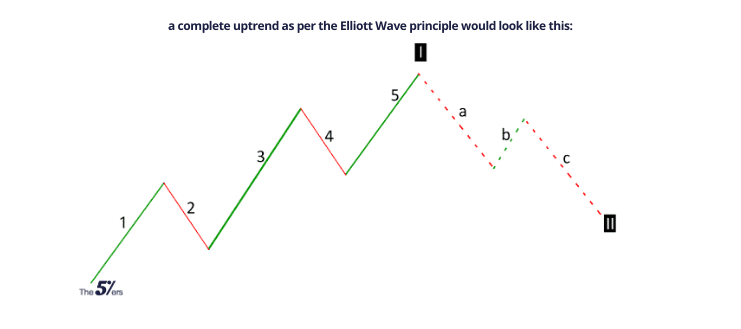 As we can see, Elliott found out that the markets move in alternating waves. During an uptrend, like the above, waves 1, 3 and 5 (impulse waves) are larger than waves 2 and 4 (corrective waves). Because of this, the prices move upwards.